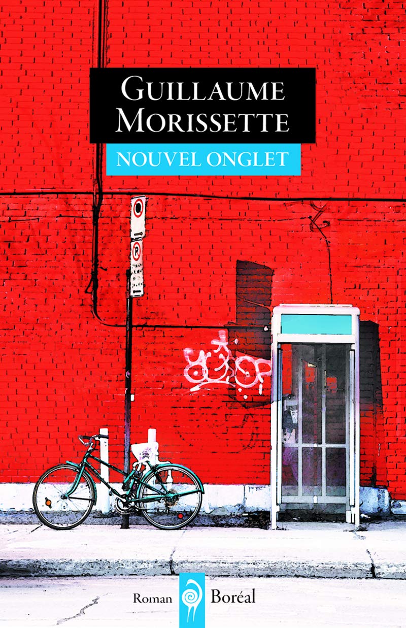 Image: Front cover of the "Nouvel onglet" book. The cover art depicts a vibrant red brick wall, a teal bicycle parked against a lamppost, and a vintage phone booth. The title "Nouvel onglet" and author "Guillaume Morissette" are prominently displayed on a black and blue banner at the top.