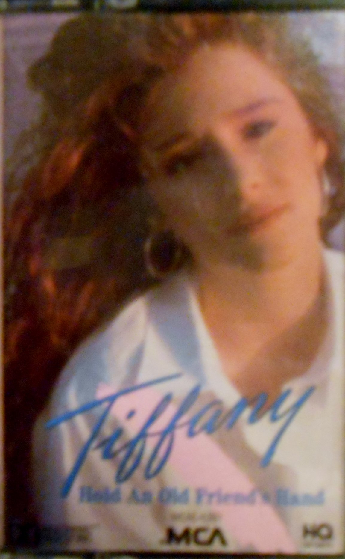 This image displays the front cover of the 'Hold An Old Friend's Hand' audio cassette. The cover features a portrait of the artist, Tiffany, with the album title and artist name prominently displayed.