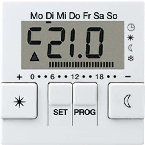 The Jung AUT238DWW is an LCD display cover designed for the Jung UT 238 E programmable thermostat mechanism. This unit provides a user interface for precise control over your heating system, featuring a clear display and intuitive buttons for programming and adjustments. It integrates a weekly timer to manage heating schedules efficiently, ensuring comfort and energy savings.