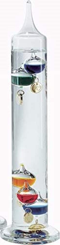 Figure 1: TFA Galileo Thermometer. This image shows the full thermometer, highlighting its clear glass structure and the colorful, weighted spheres suspended within the liquid.