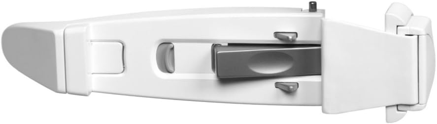 Figur 1: The Safety 1st Prograde No-Drill Top of Door Lock. This image shows the lock's main body, the gray clamping mechanism, and the release levers. The lock is designed to fit over the top edge of a door, with the clamping mechanism extending to secure against the door frame.