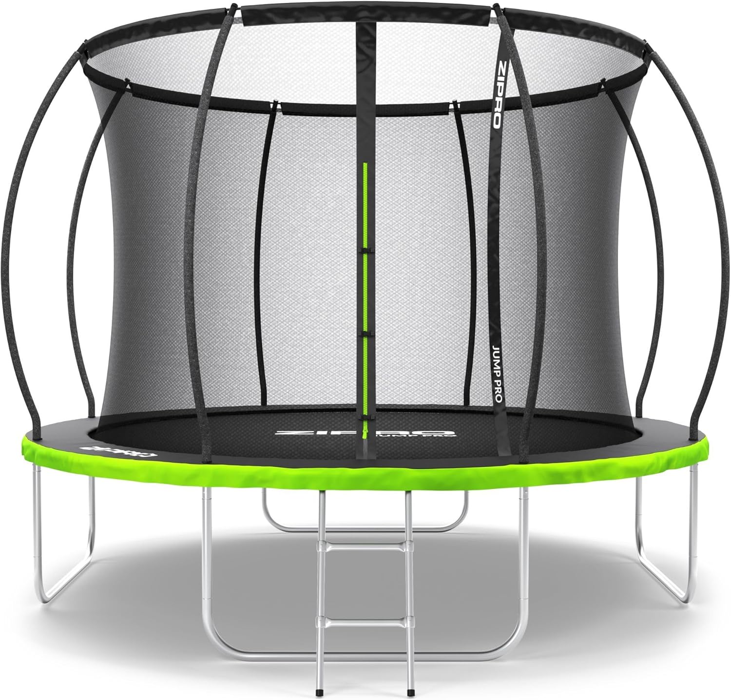 Image: The ZIPRO JumpPro PREMIUM Trampoline, featuring a black jumping mat, green spring cover, and a tall safety net with curved poles.