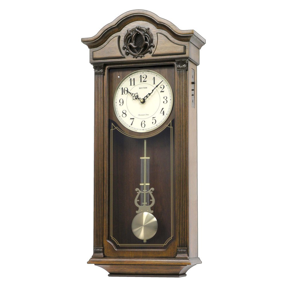 Billede: Forside view of the Rhythm USA Claremont Wall Clock, showcasing its elegant wooden frame, analog dial, and visible pendulum.