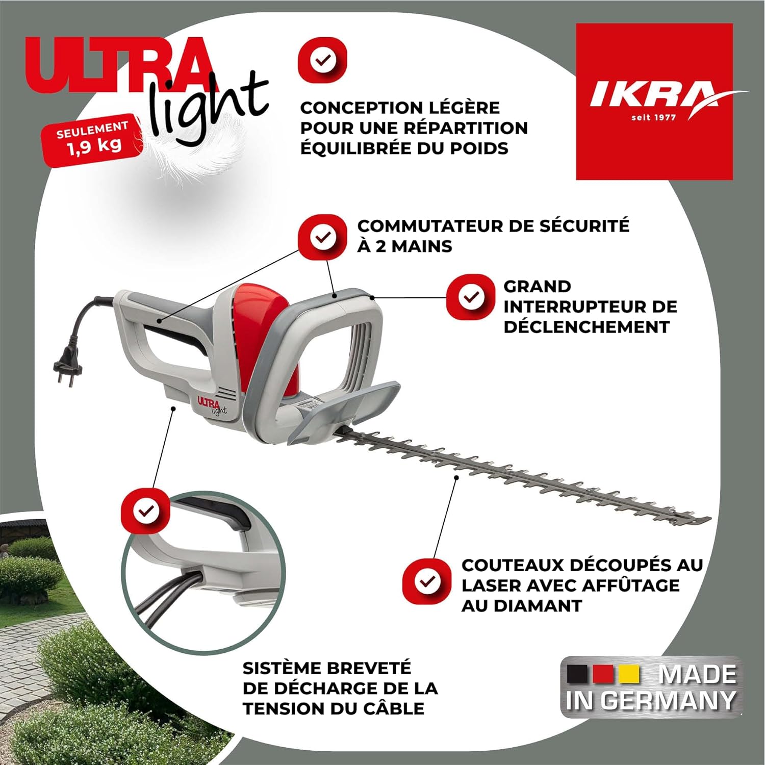 The IKRA Ultralight FHS 1545 Electric Hedge Trimmer is designed for efficient and comfortable hedge and shrub maintenance. This manual provides essential information for safe operation, proper setup, effective use, and routine maintenance of your hedge trimmer. Please read this manual thoroughly before first use and keep it for future reference.