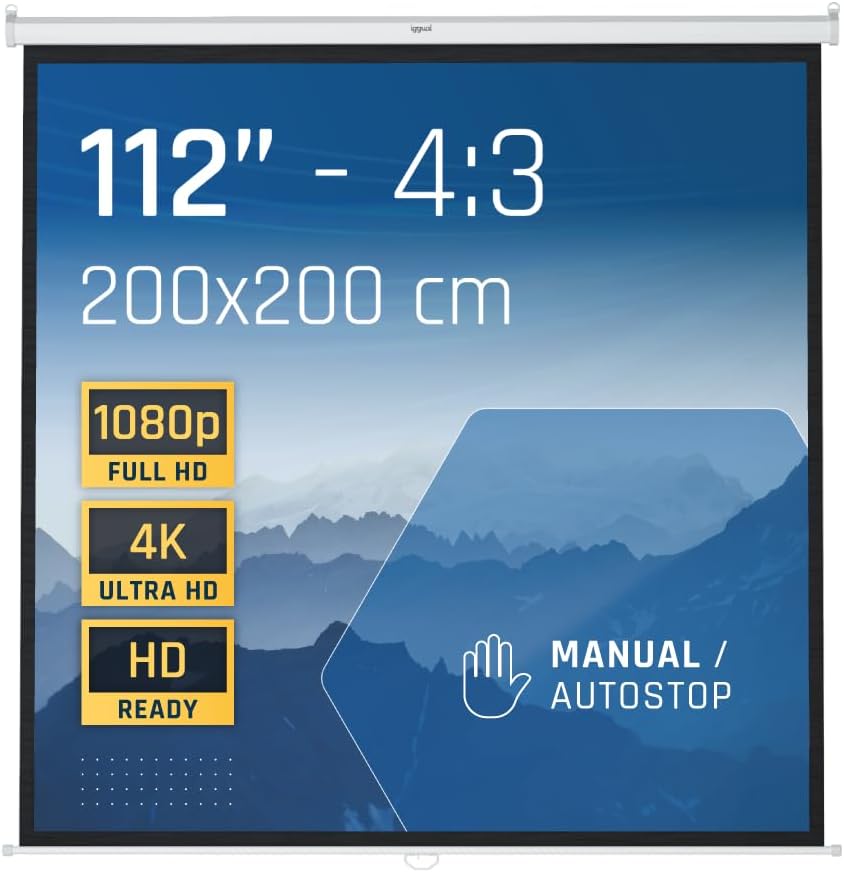 Figur 1.1: iggual Manual Projection Screen, highlighting its 112-inch diagonal size, 4:3 aspect ratio, 200x200 cm dimensions, and compatibility with various resolutions including 1080p and 4K. It features a manual pull-down mechanism with an autostop function.