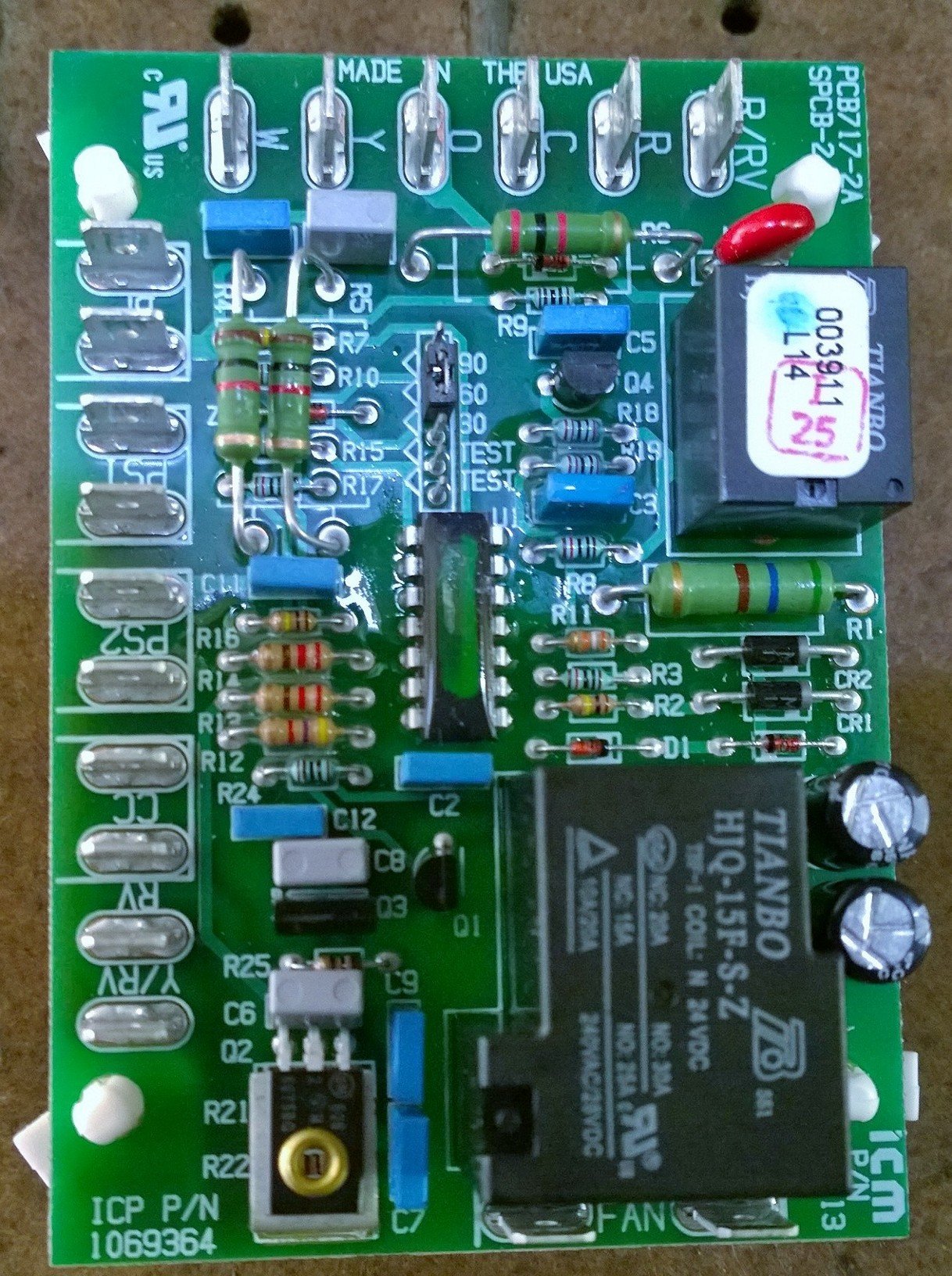 Figure 1: ICM Controls 304C Heat Pump Defrost Timer circuit board. This image displays the green circuit board with various electronic components including resistors, capacitors, diodes, and a large black Tianbo relay. Key markings visible include "MADE IN THE USA", "PCB717-2A", "TIANBO HJQ-15F-S-Z" for the relay, and "ICP P/N 1069364" at the bottom left.