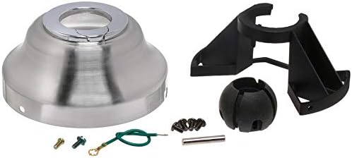 Billede: Overview of all components included in the Harbor Breeze Angle Mount Capable Ceiling Fan Mounting Hardware kit. This includes the brushed nickel canopy, a black plastic mounting bracket, a black plastic ball joint, various screws, a metal pin, and a green ground wire.