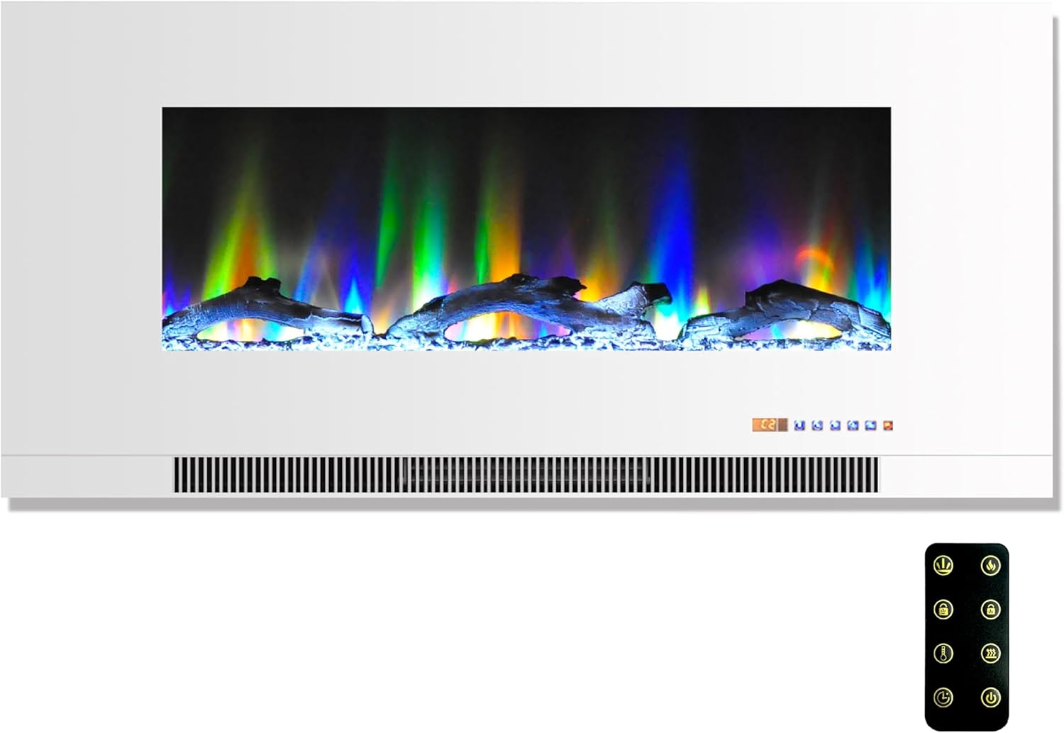 The Cambridge electric fireplace offers a multi-color flame display with driftwood logs and provides supplemental heat for indoor spaces. It is designed for wall mounting to optimize room space.