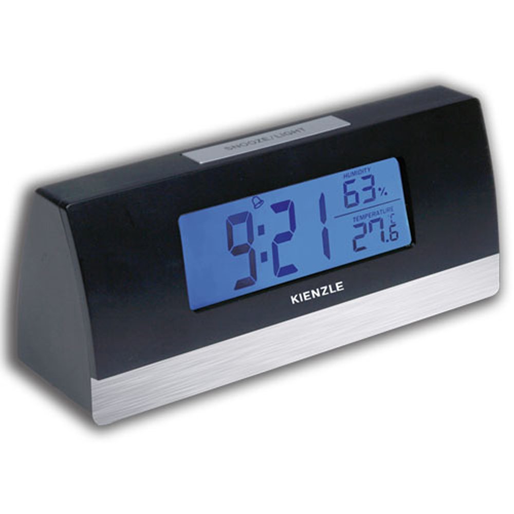 Image: The Kienzle Digi Time Digital Alarm Clock, black with a silver base, displaying the time 9:21, humidity at 63%, and temperature at 27.6 degrees Celsius on its blue backlit screen. The Kienzle logo is visible below the display, and a 'SNOOZE/LIGHT' button is on top.