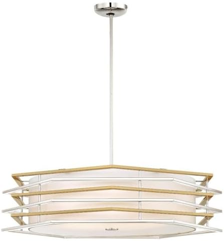George Kovacs Levels LED Pendant Light, front view, visasing the polished nickel frame and honey gold accents with the white fabric shade.