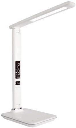 This image shows the Ottlite Executive Desk Lamp in white, featuring a sleek design with an adjustable arm and a rectangular LED light panel. The base includes a digital display showing time and temperature, along with touch controls.