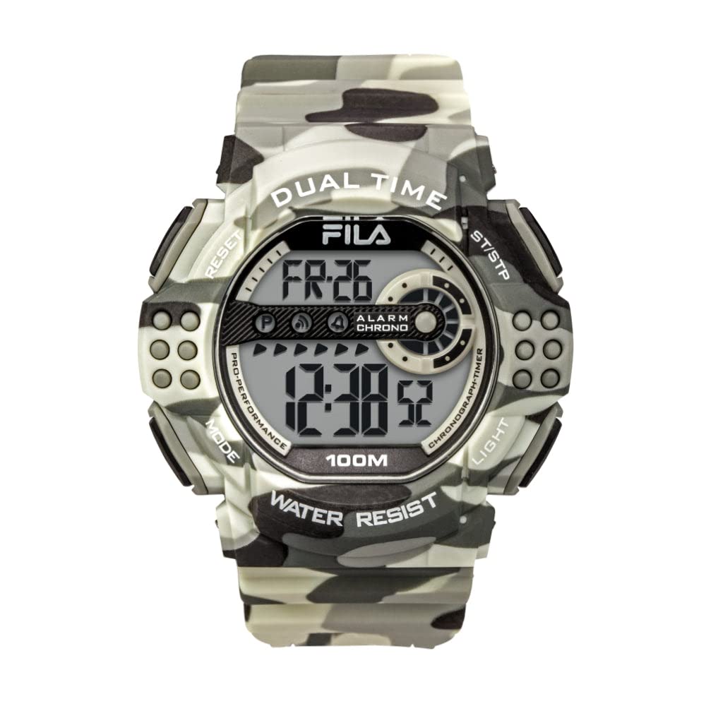 Billedbeskrivelse: A FILA Digital Watch, Model 38-171-004, displayed in its original packaging. The watch features a camouflage-patterned case and strap, with a black digital display showing "WE 8" (Wednesday 8th) and "7:02" (time). Text on the watch face indicates "ALARM", "CHRONO", "100M WATER RESIST". A product tag with "38-171-004" and a barcode is visible in the foreground.