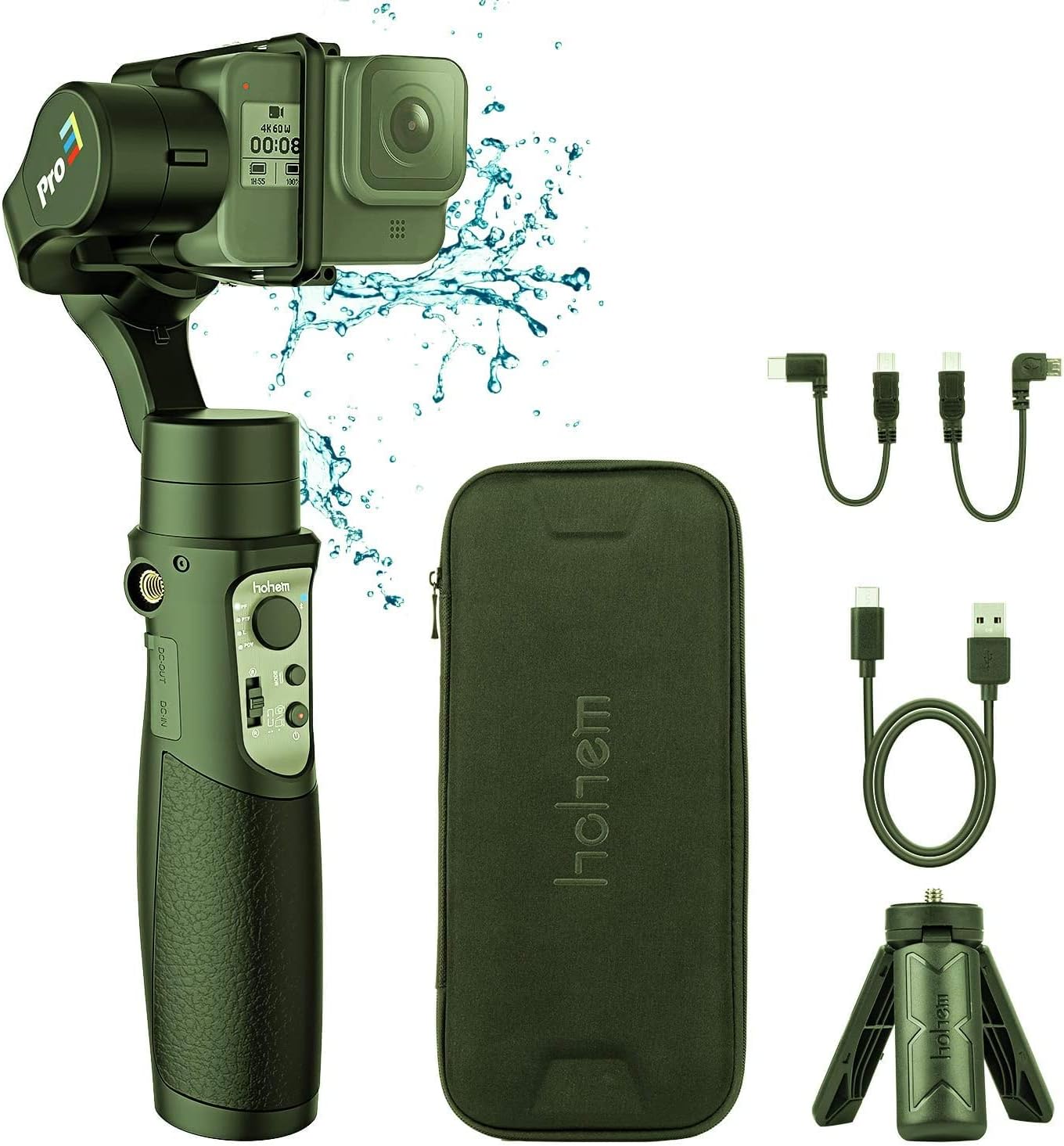 Image: Hohem iSteady Pro Gimbal, carrying case, mini tripod, and various charging cables.