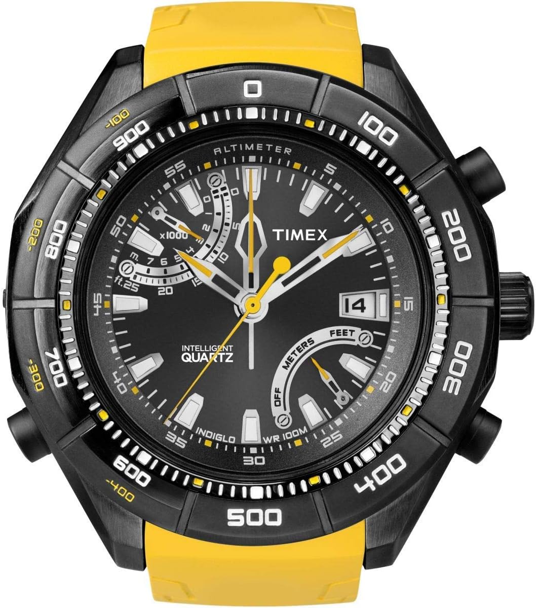 Billede: Forside view af Timex T2N730 Sportsuret, vistasindens sorte urskive, gule detaljer og slidstærke gule gummirem. Urskiven har højdemåler, datovisning og selvlysende visere.