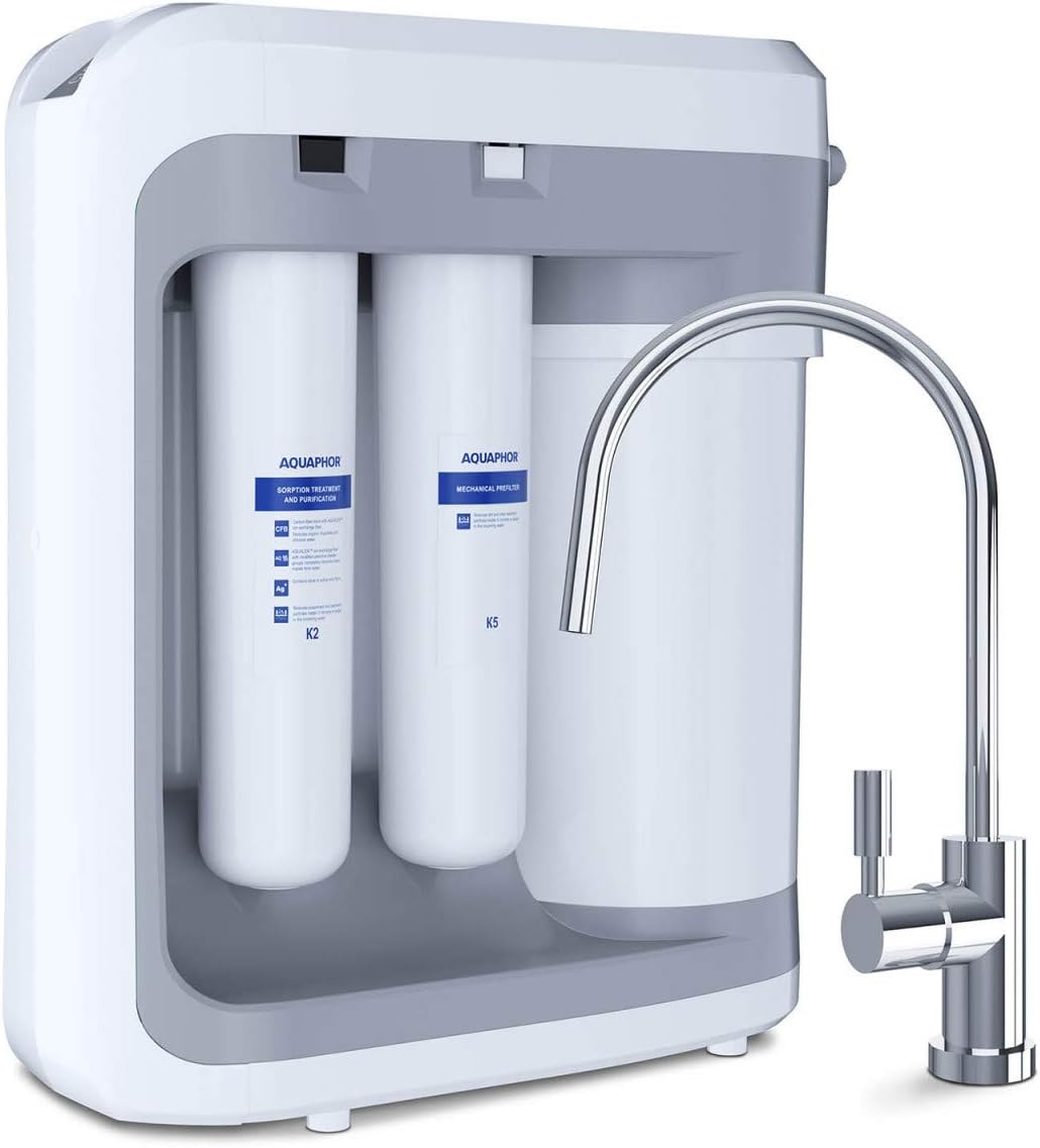 Billede 1: Aquaphor RO-203 omvendt osmose vandfiltreringssystem, der viser hovedenheden med synlige K2- og K5-filterpatroner, den integrerede tank og den tilhørende forkromede vandhane.