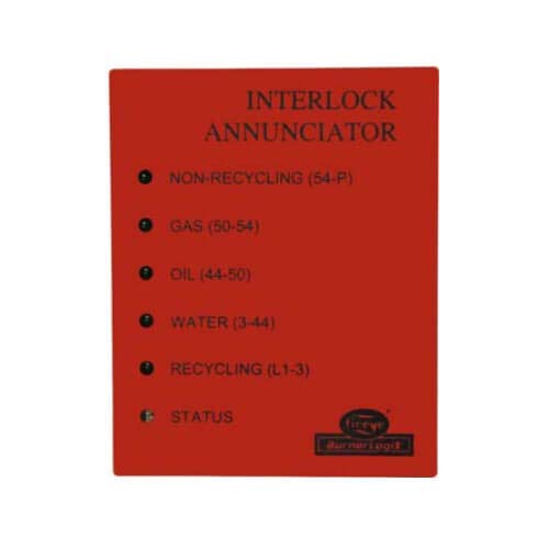 Figur 1: Front panel of the Fireye Interlock Annunciator module. This image displays the front panel of the Fireye Interlock Annunciator module. It features indicators for 'NON-RECYCLING (54-P)', 'GAS (50-54)', 'OIL (44-50)', 'WATER (3-44)', 'RECYCLING (L1-3)', and 'STATUS', along with the Fireye logo.