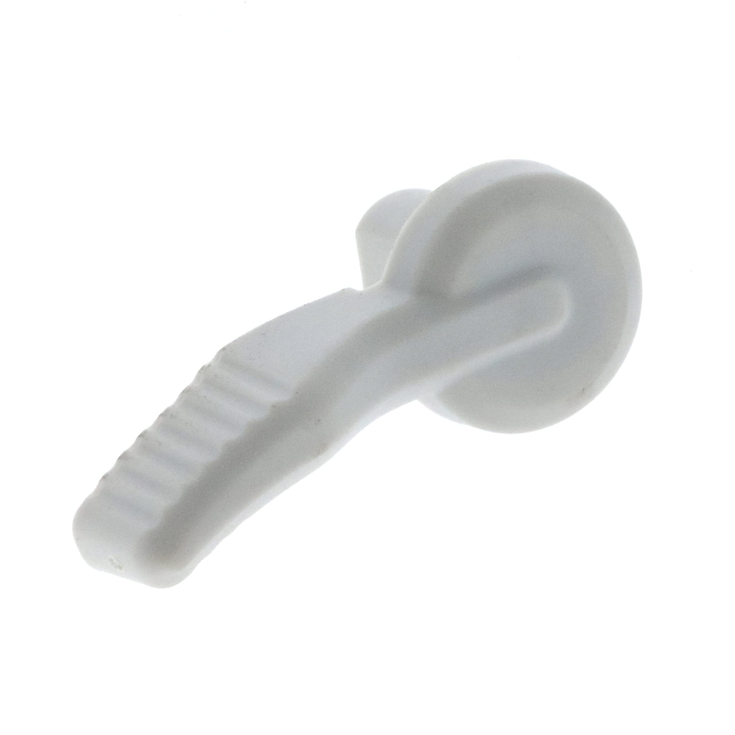 Figur 1: Et nærbillede view of the white plastic Homelite 527985002 replacement cruise control lever. The lever features a textured grip on one end and a rounded, wheel-like component on the other, designed for precise control.