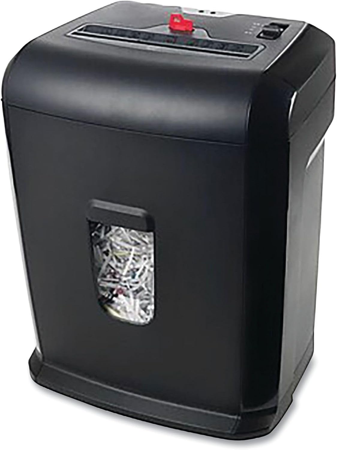 The shredder features a 5-gallon pull-out wastebasket. Monitor the fill level through the transparent window on the front of the unit.