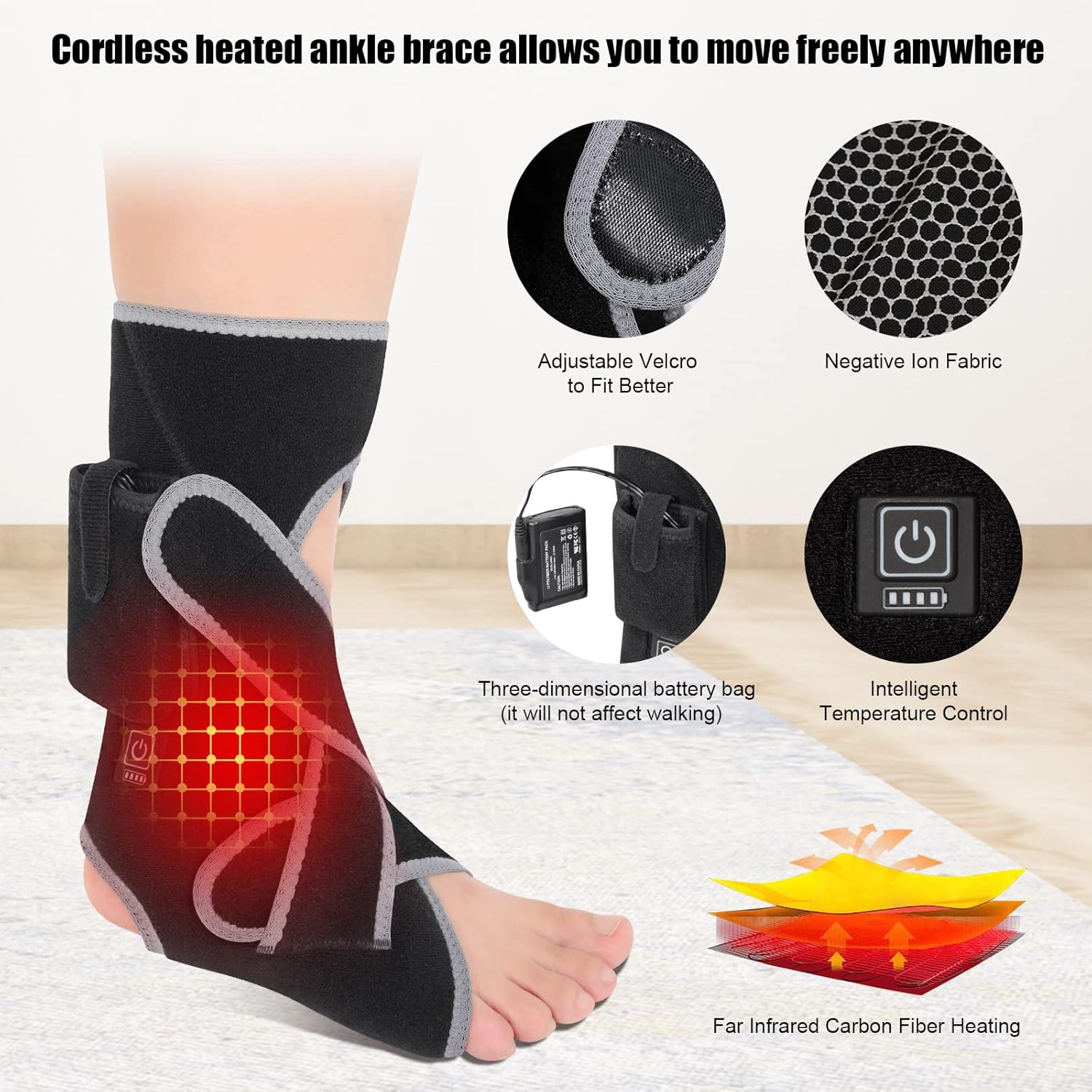 The wrap features a three-dimensional pocket for the battery, ensuring comfort and freedom of movement. It is designed to fit most foot and ankle sizes, with a heating area of approximately 6 x 9 inches, covering common pain areas such as the Achilles tendon.