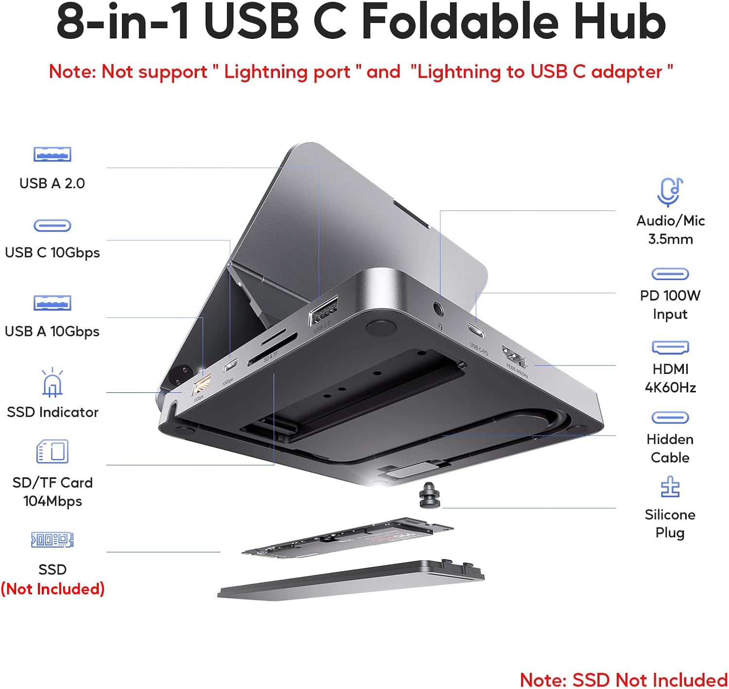 Thank you for choosing the PULWTOP USB C Hub Docking Station. This versatile device is designed to expand the connectivity and functionality of your USB-C enabled tablets, including iPad Pro, iPad M4, and iPad Mini 6th Gen. It integrates multiple ports for data transfer, video output, power delivery, and storage expansion, all within a compact and adjustable stand design.