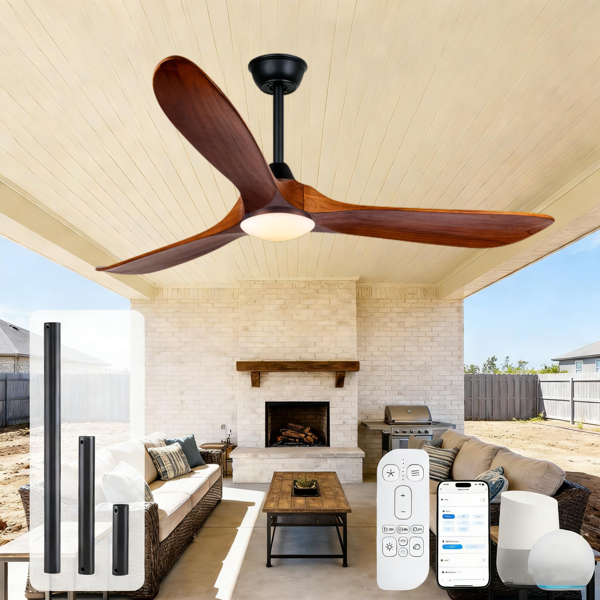 This ceiling fan features a powerful yet quiet DC motor, solid wood blades, and dual control modes (remote and wall switch). It is designed for both indoor and outdoor use, offering reversible functionality for year-round comfort and energy efficiency.