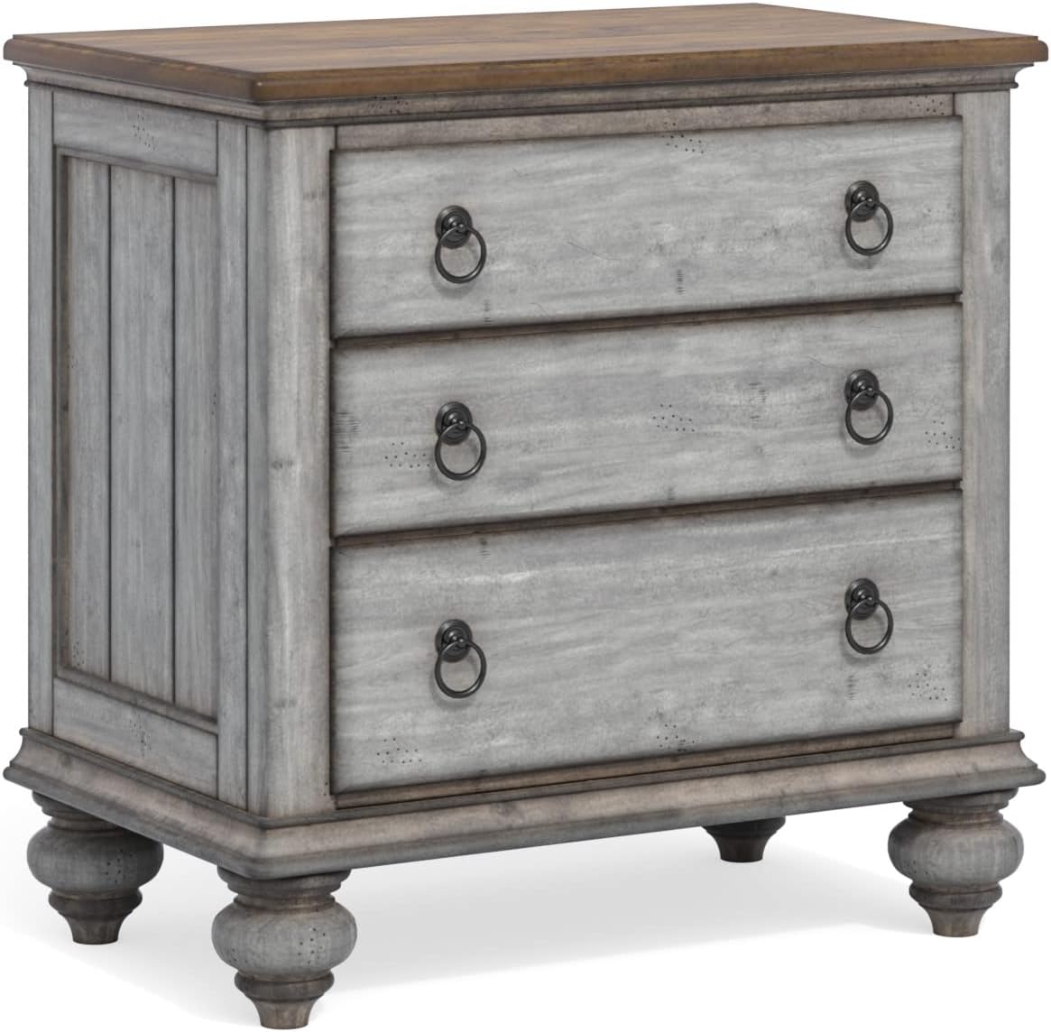Billede 1: Forside view of the assembled Homestyles Plymouth Nightstand. It features a distressed graywash body, a brown top, and three drawers with ring-style gunmetal pulls.