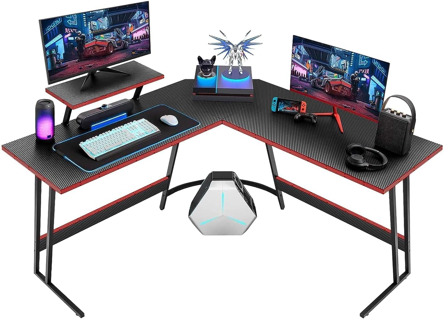 The XTRIKE ME DK-04 is an L-shaped gaming desk designed for home office and gaming setups. It features a durable construction with a carbon fiber texture desktop, providing ample space for multiple monitors and accessories. The desk includes an adjustable monitor stand, a headphone hook, and a cup holder for enhanced convenience.