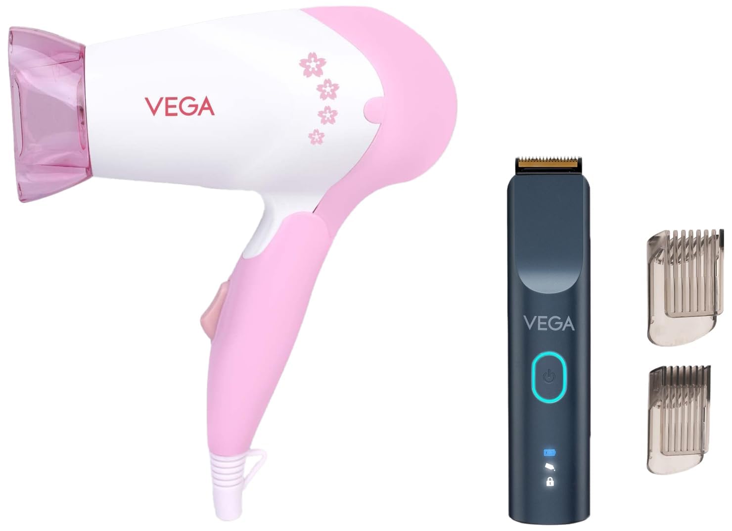 This image displays both the Vega Smartone S2 Beard Trimmer and the Vega Insta Glam 1000W Hair Dryer together, showcasing den komplette produktpakke.