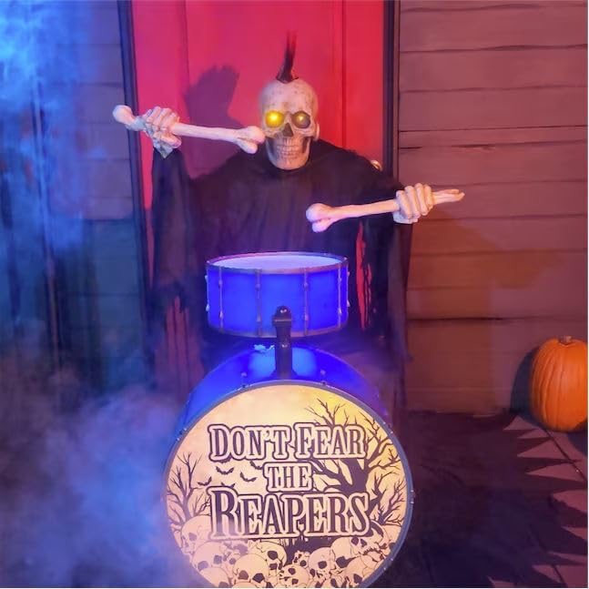 Denne manual indeholder detaljerede instruktioner til opsætning, betjening og vedligeholdelse af din Haunted Living Reaper Animatronic Bluetooth-trommeslager. Denne overdimensionerede animatronic er designet til at oprette forbindelse til Bluetooth-enheder for at afspille musik, med realistisk trommesimulering og blinkende lys. Den kan aktiveres via Bluetooth, batteri, 6V 2A DC-adapter, lyd, bevægelse eller en valgfri fodpude/knap. Den kan også synkroniseres med Bluetooth-bandguitaristen (sælges separat) for en fuld bandeffekt.