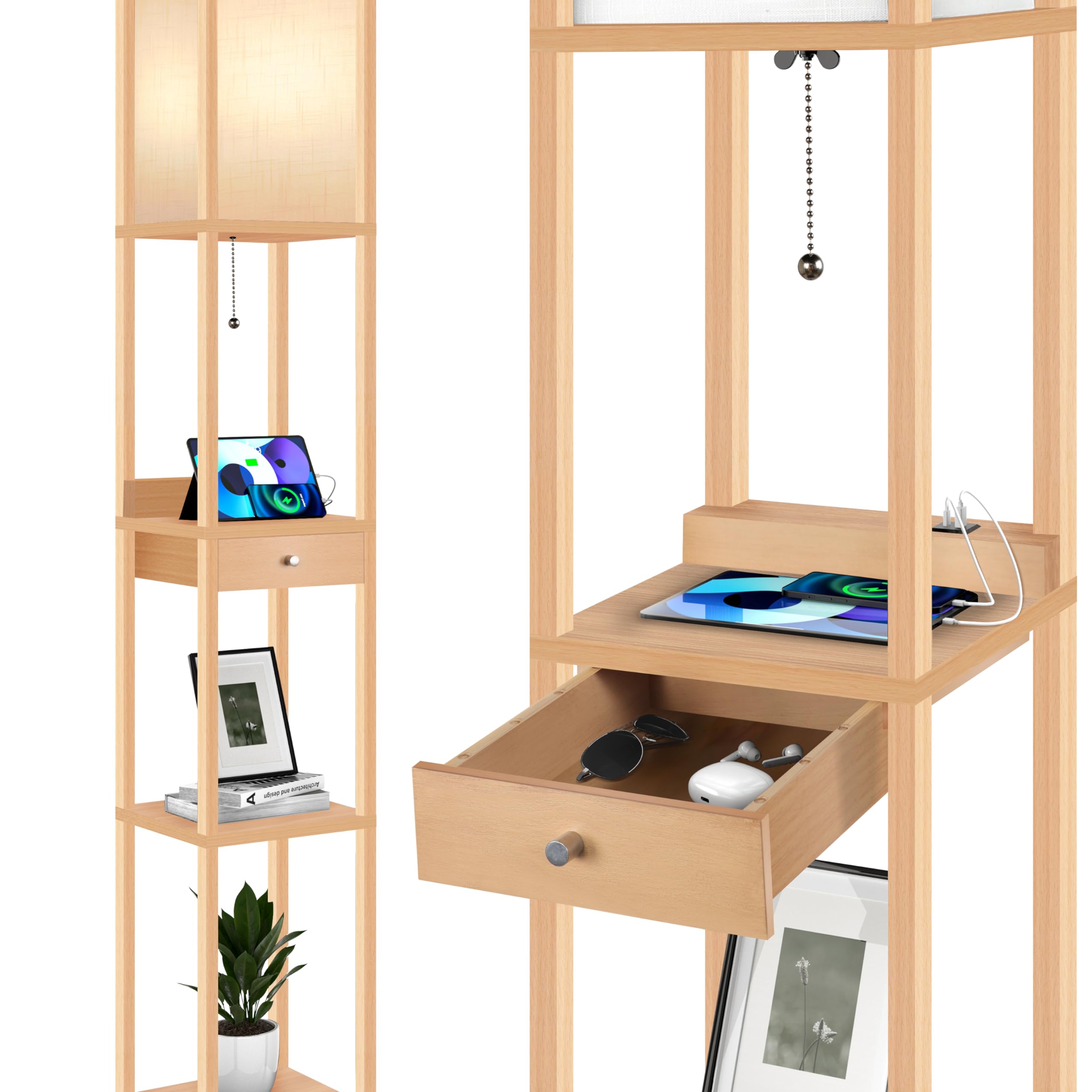 OUTON LED gulvlampe Lamp is a versatile lighting solution designed to enhance your living space. It combines a modern floor lamp with practical storage, featuring three shelves and a spacious sliding drawer. Equipped with a 9-watt LED bulb, it offers three adjustable color temperatures (Warm White, Natural White, Daylight) and includes a 1-hour timer function. For added convenience, the lamp integrates a 2-in-1 charging station with a Type-C fast charging port and a 5V/2A USB port, allowing you to charge multiple devices simultaneously.