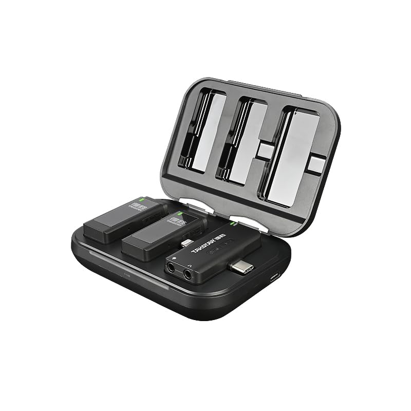 The portable charging case stores and recharges the transmitter and receiver units, providing extended battery life for on-the-go use.