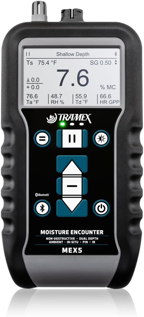 Tramex Moisture Encounter MEX5 er en alsidig, digital, ikke-destruktiv fugtighedsmåler designet til præcis vurdering af fugtindhold i en bred vifte af byggematerialer og træ. Den har dobbelt dybdeindtrængning, et indbygget hygrometer til omgivelsesforhold, et infrarødt overfladetermometer og kompatibilitet med eksterne in-situ RH- og pin-prober. Dette instrument er et vigtigt værktøj for fagfolk inden for træ-, trægulve-, bygningsfugtinspektion og vandskadesanering.