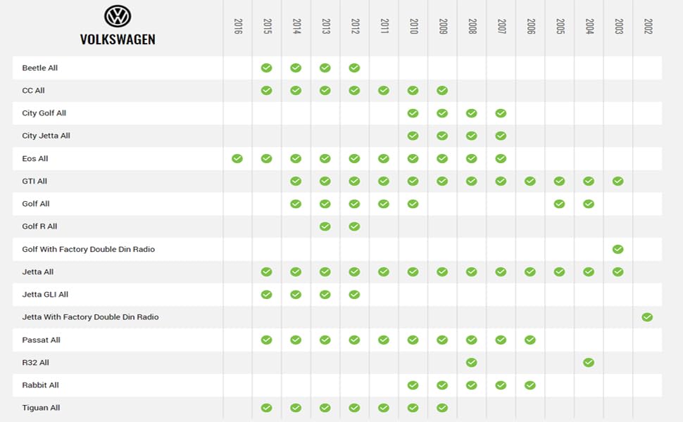 Image: Volkswagen vehicle compatibility chart for the HRN-SR-VW1 T-Harness, showing various models and compatible years from 2002 to 2016.