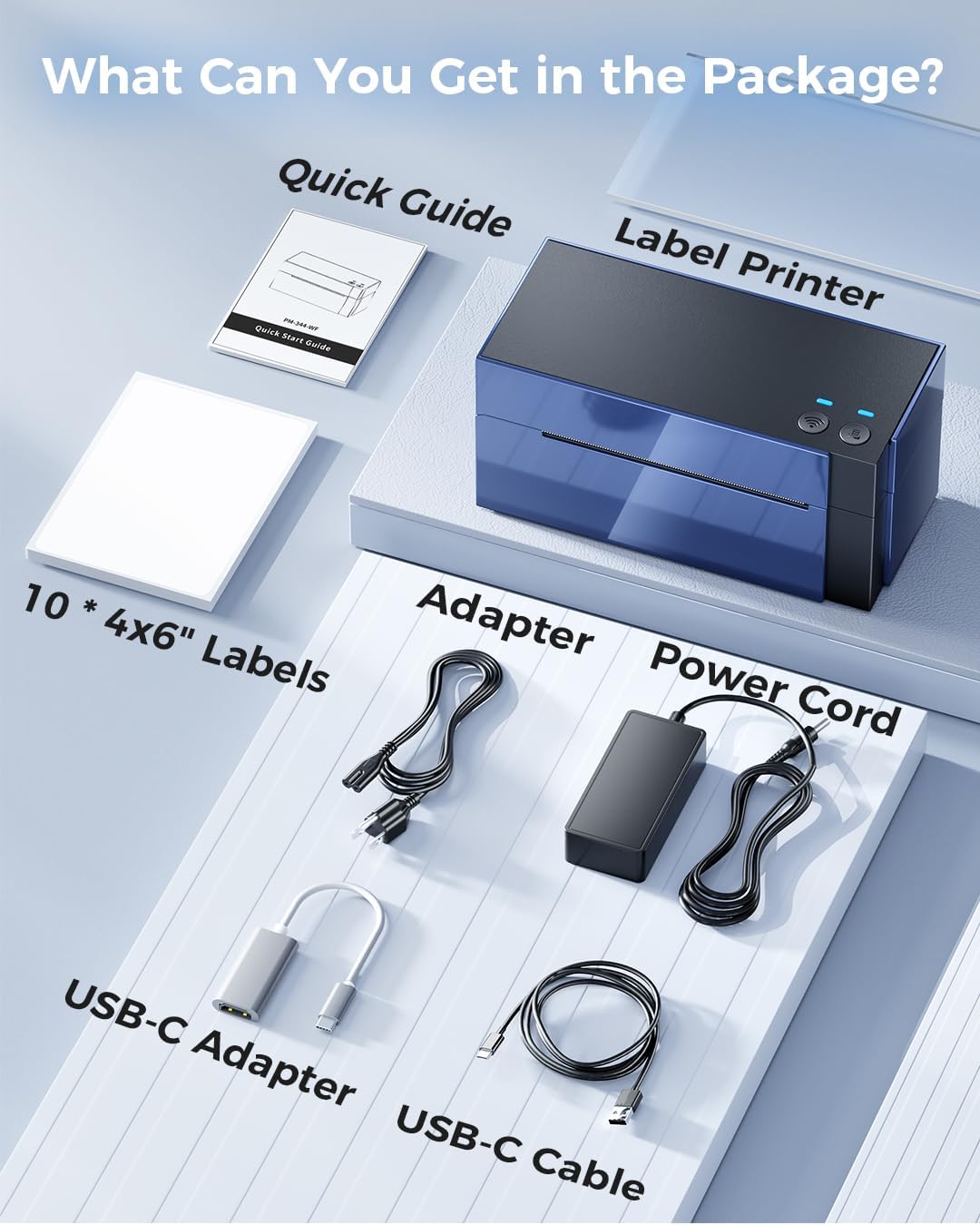 Image: All components included in the Memoking WiFi Thermal Label Printer package, including the printer, power adapter, USB cables, user guide, and test labels.