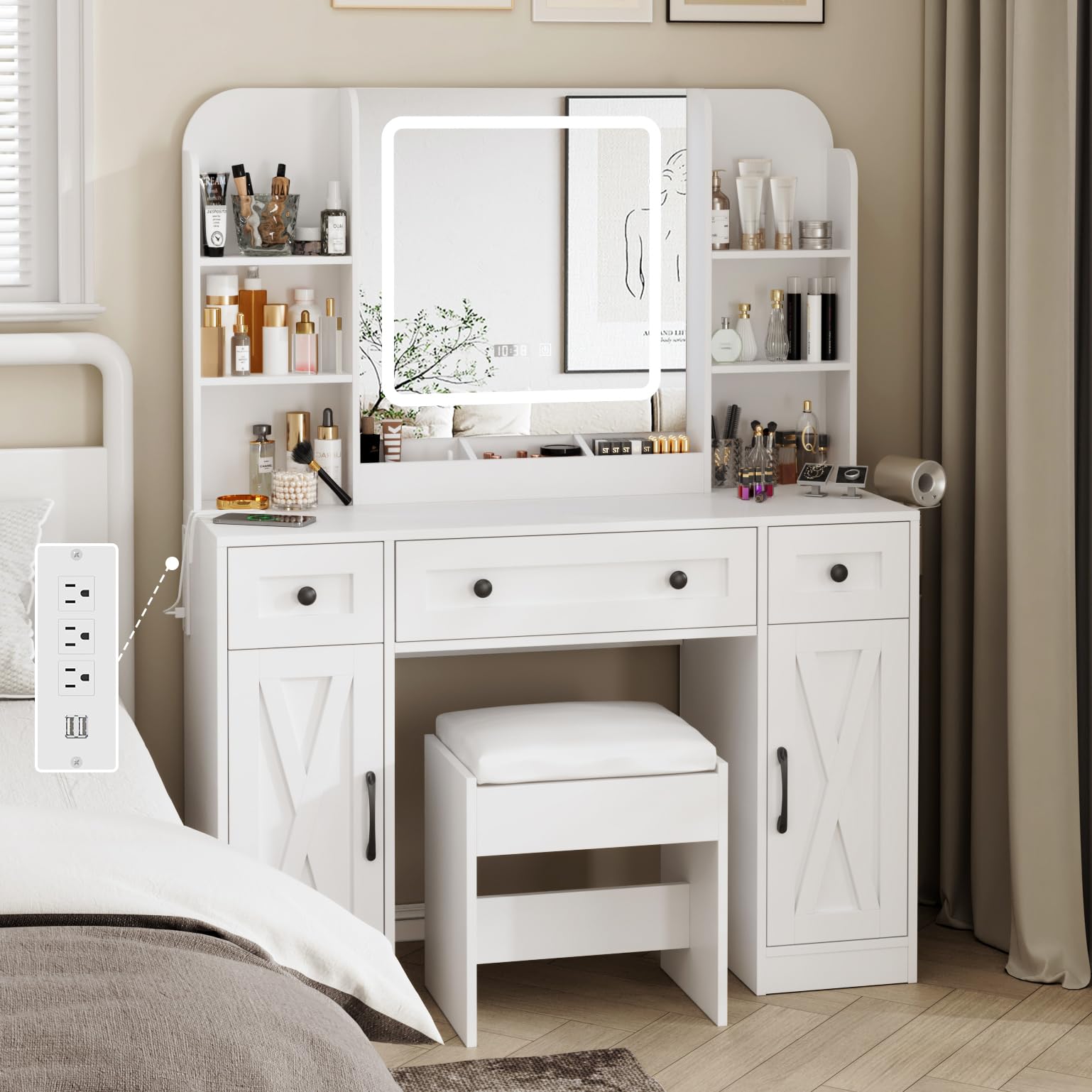 The vanity desk is equipped with a convenient charging station located on the side. This station includes:
