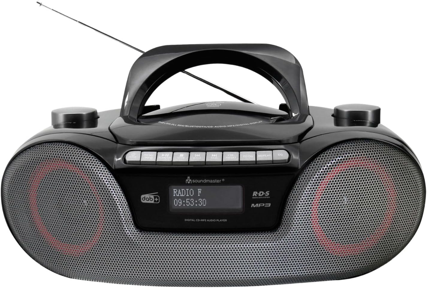 Billede: Front view of the Soundmaster SCD8300SW Boombox. It features a central handle, an extendable antenna, a display screen, control buttons on top, and two speaker grilles on the front. The display shows 'RADIO F' and '09:53:30'.