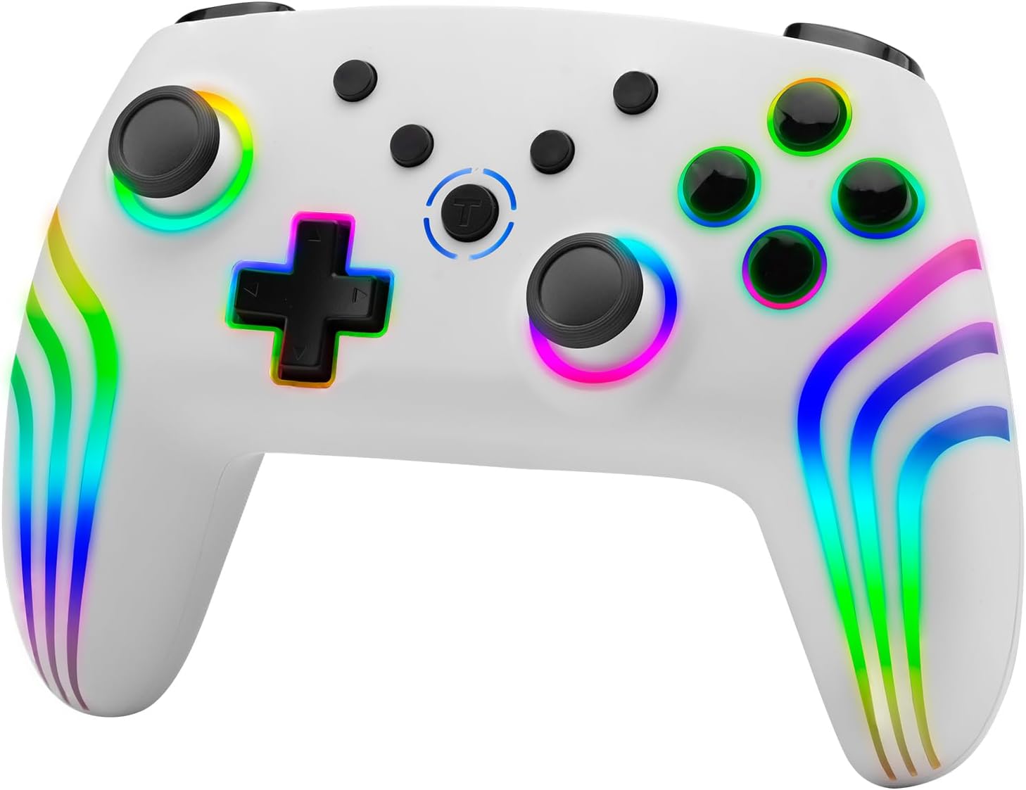 The controller features customizable multi-color RGB LED lighting effects.