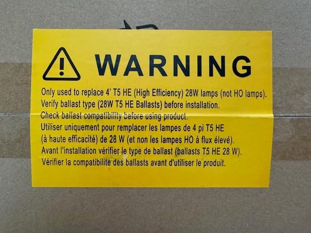 Billedbeskrivelse: A yellow warning label with black text. The text states: "WARNING Only used to replace 4' T5 HE (High Efficiency) 28W lamps (not HO lamps). Verify ballast type (28W T5 HE Ballasts) before installation. Check ballast compatibility before using product." Below the English text, the same warning is provided in French.