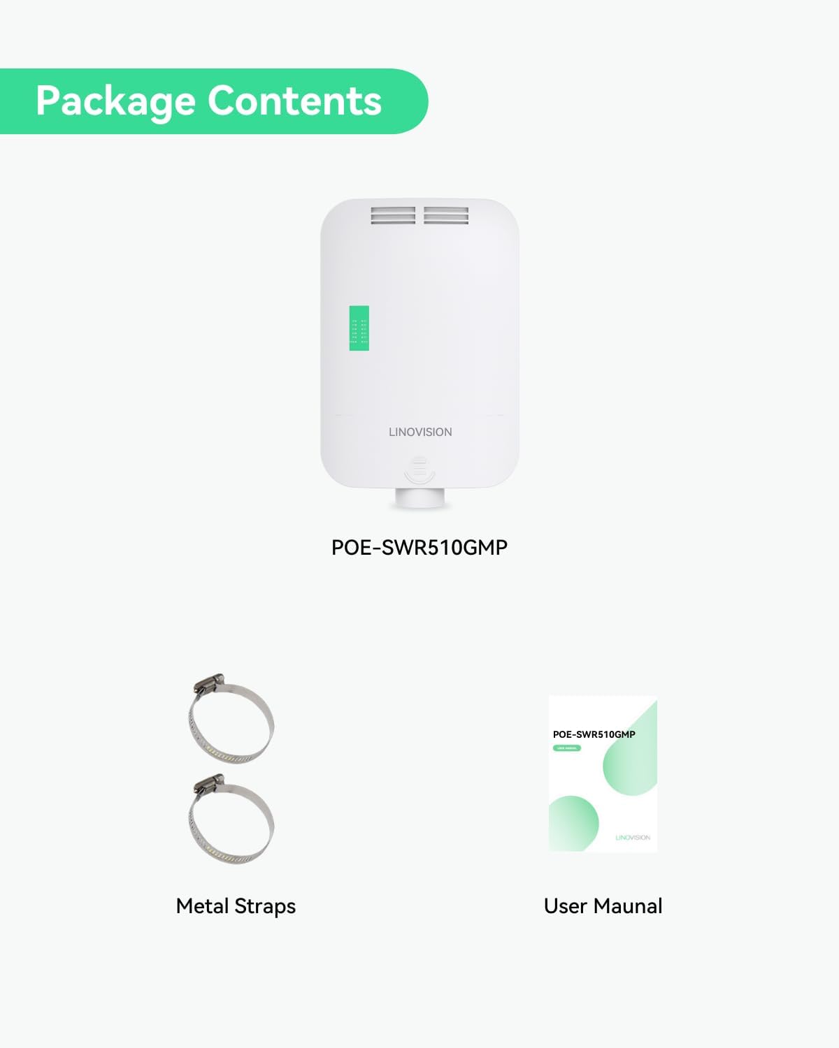 The LINOVISION POE-SWR510GMP features a robust, waterproof enclosure designed for outdoor environments. Key components include: