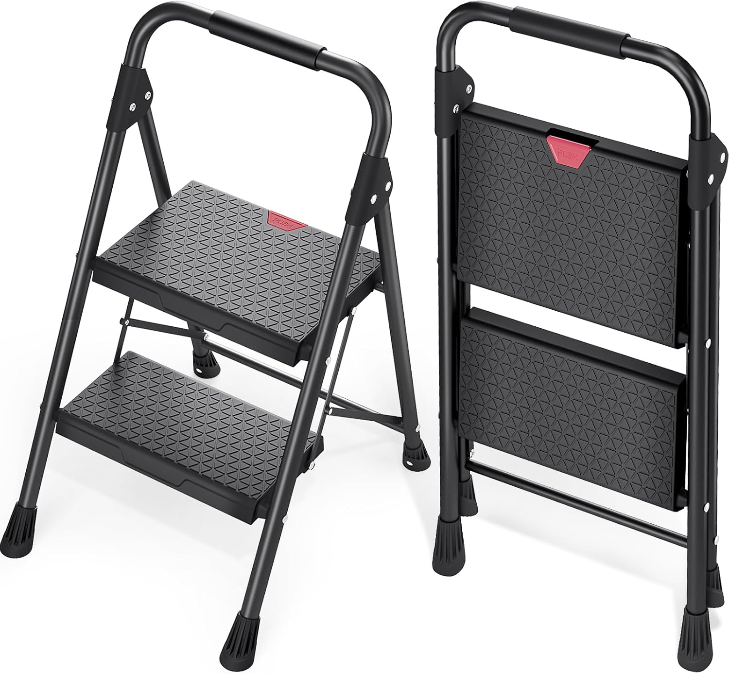 The KINGRACK 2-Step Folding Ladder is a sturdy and portable step stool designed for various indoor and outdoor tasks. It features a heavy-duty steel frame, anti-slip wide pedals, an ergonomic handrail, and an enhanced safety lock system. The ladder supports a maximum load capacity of 800 lbs.
