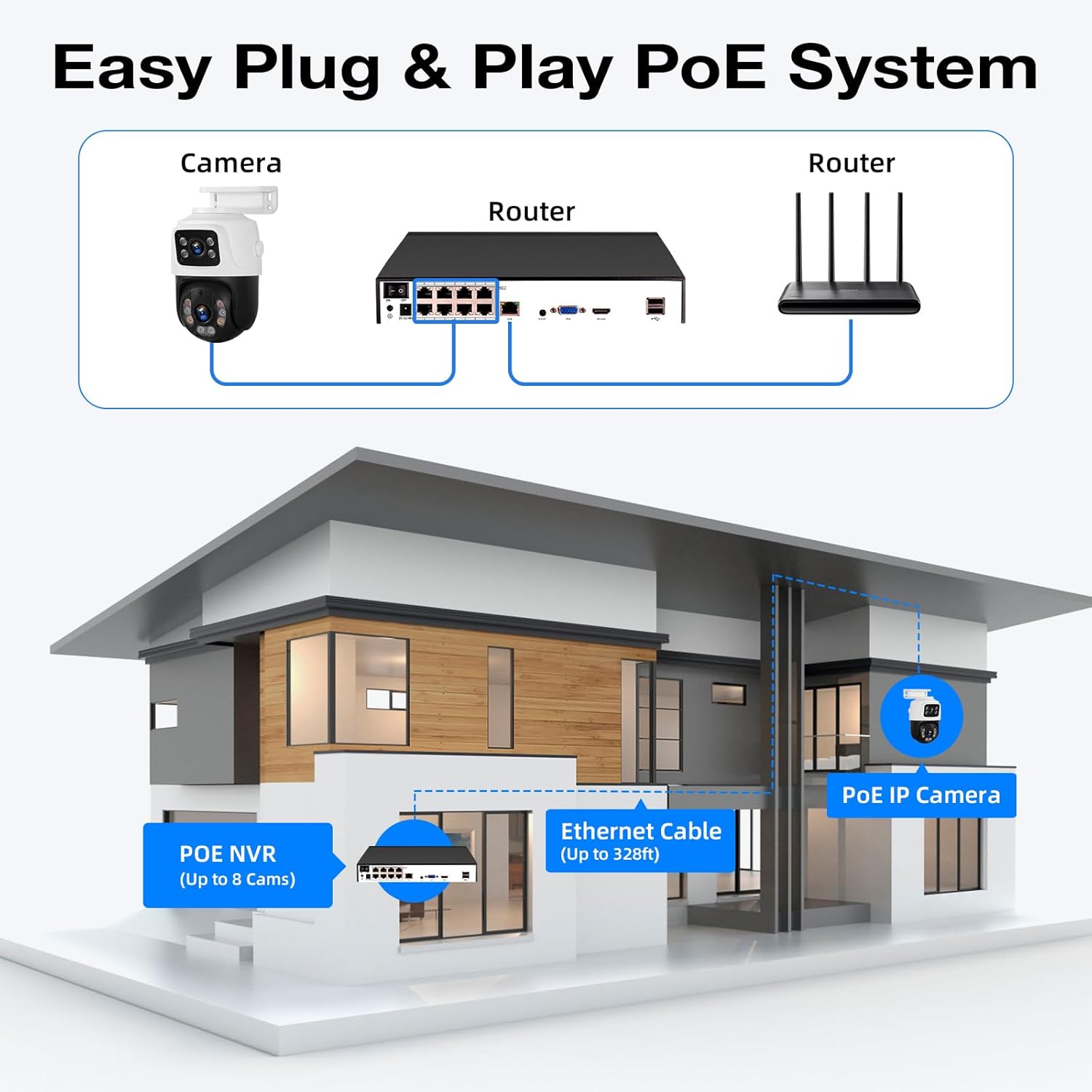 The NVR is the central unit for recording, storing, and managing video footage from your cameras. It features 8 PoE ports for direct camera connection, eliminating the need for separate power adapters for each camera.