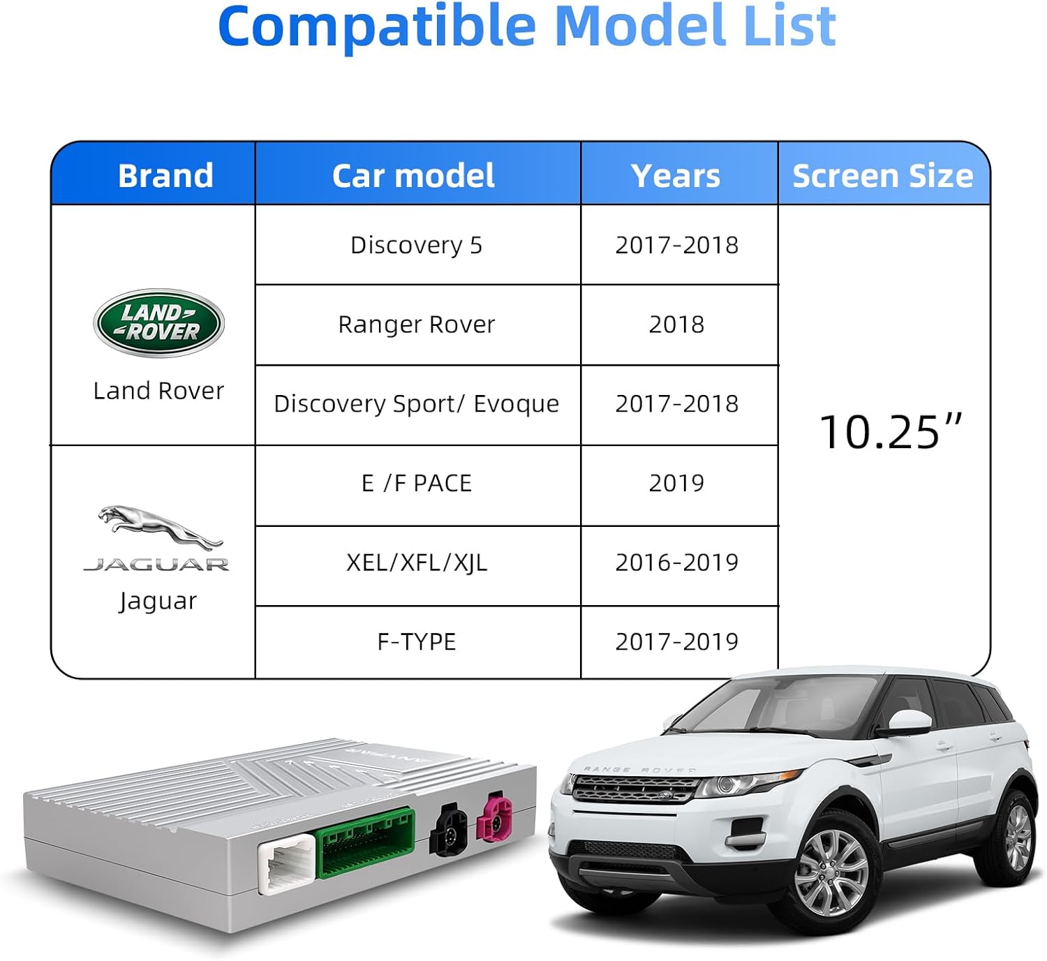This decoder is specifically compatible with 2016–2019 Land Rover and Jaguar vehicles equipped with a Harman head unit og en 10.25 tommer skærm. Compatible models include: