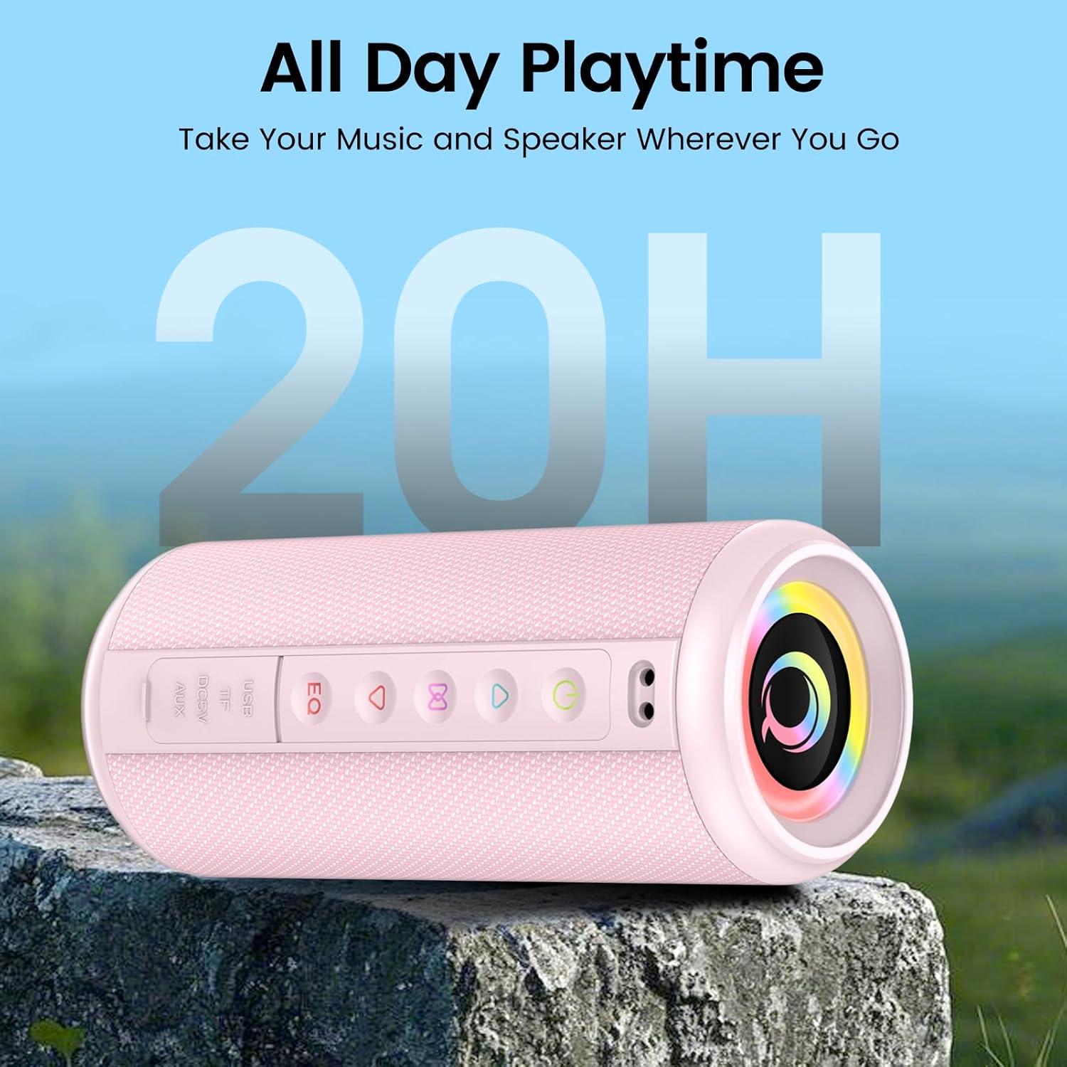 The speaker features intuitive buttons for control: